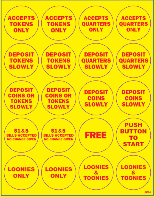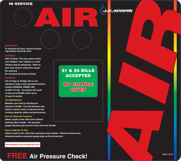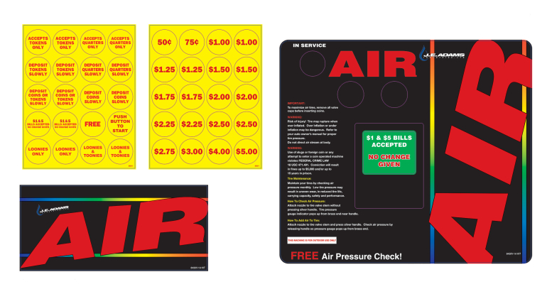- Air Machine Decal Kit for Units with Bill Acceptors (Models: 8652A-2A, 8652AB-2A, 8671-2BGA, 8671-2GA)